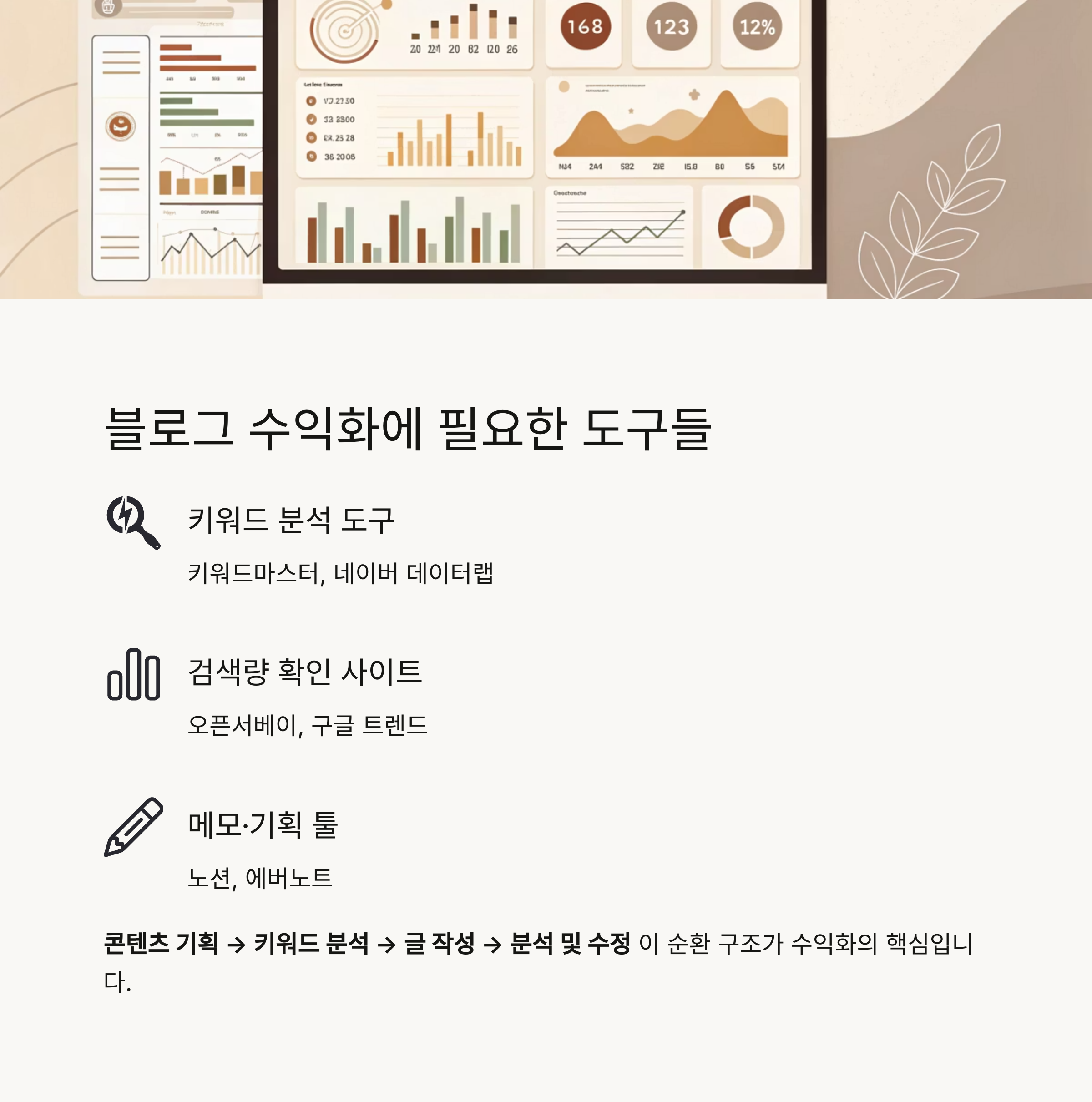 키워드 분석 도구, 검색량 확인 사이트, 메모·기획 툴 정도면 충분합니다.